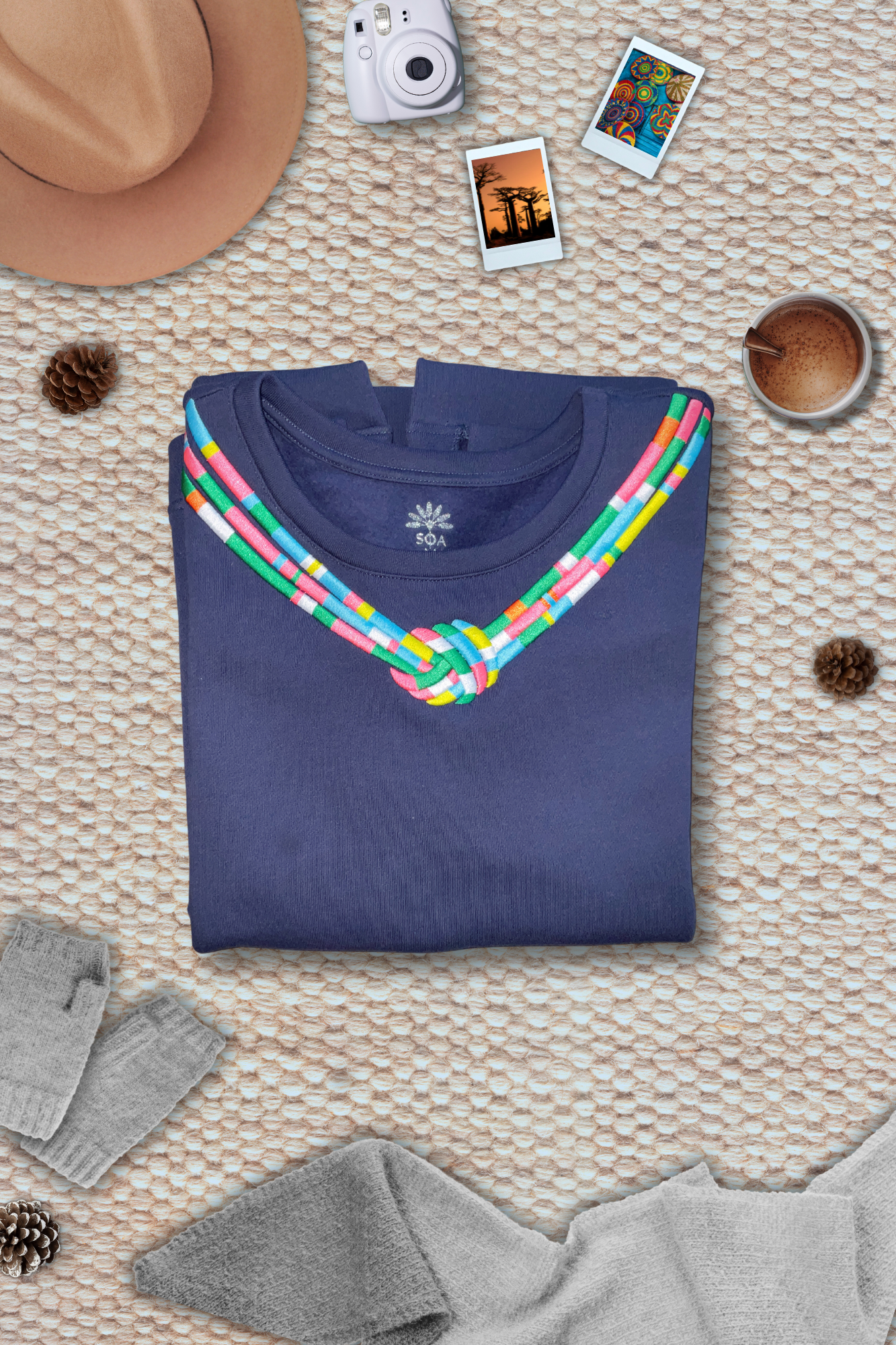 120,00 €Ce sweat unique s’inspire de la richesse culturelle de l’Afrique et transpose l’éclat d’un collier traditionnel sur un vêtement d’hiver. Il fusionne harmonieusement l’inspiration africaine avec un design moderne et confortable. Les fentes latérales du sweat ajoutent une touche décontractée et permettent une utilisation pratique des poches. De plus, ces fentes sont brodées pour rappeler le motif du collier africain, apportant ainsi une élégance et un raffinement supplémentaires. Cette pièce de mode allie style, confort, originalité et respect de l’environnement. Un sweat à s’offrir ou à offrir à celles qui veulent captiver les regards.